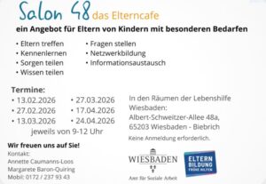 Der Salon 48 ist ein offenes Angebot für Eltern von Kindern mit besonderen Bedarfen. In regelmäßigen Treffen erhalten Eltern die Möglichkeit, Fragen zu stellen, Erfahrungen auszutauschen, Wissen zu teilen und spannenden Fachvorträgen zu folgen. Im Mittelpunkt stehen Vernetzung, gegenseitige Unterstützung und wertvolle Impulse rund um das Thema Inklusion.